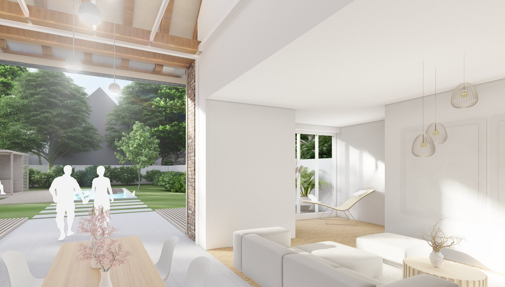 Die Tenne mit den zwei Scheunentoren zum Hof und Garten bleibt als Konzept und Durchgang erhalten, das Gebäude behält seinen Scheunencharakter.